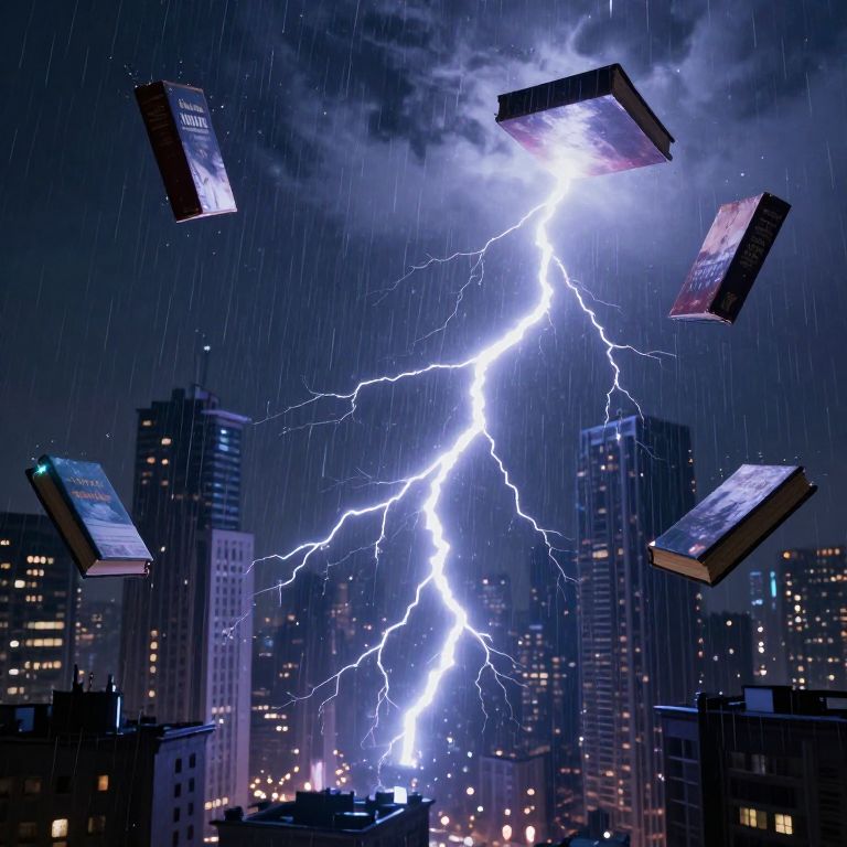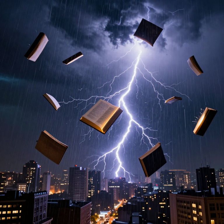 Books suspended mid-air, pages aglow, dance amidst a tempest of lightning and rain, defying gravity in a surreal symphony above a city illuminated by the storm's electric glow.