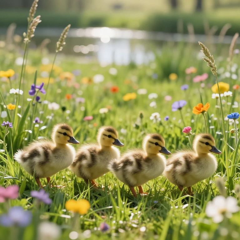 Ducklings waddling through a vibrant spring meadow, surrounded by colorful wildflowers and tall grasses, soft morning light casting gentle shadows, a serene pond shimmering in the background, capturing the innocence and charm of baby ducks in nature.