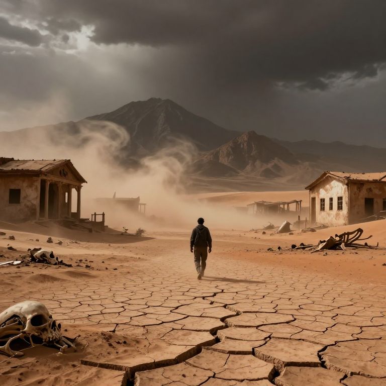 Apocalyptic desert wasteland featuring cracked earth, skeletal remains of buildings, dust storms swirling around distant mountains, muted color palette with orange and gray tones, lone survivor walking towards shattered horizon, sense of desolation and hopelessness.