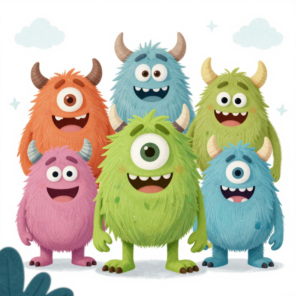 A playful group of mischievous monsters, including a green creature with large eyes and a blue one with a wide grin, are depicted in a whimsical children's illustration.