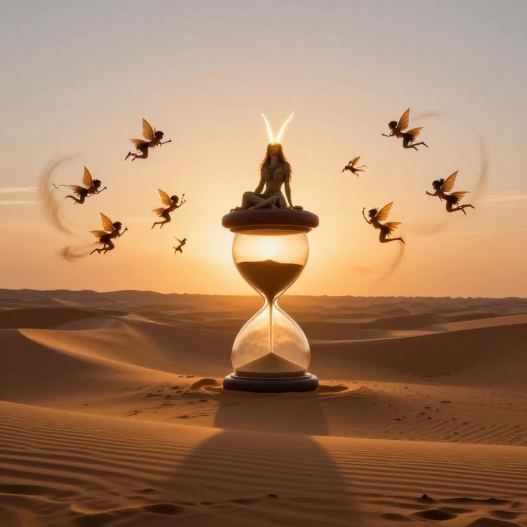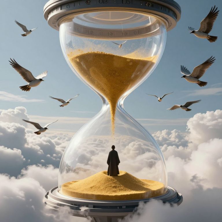 Imagine a surreal dreamscape dominated by an enormous hourglass casting its silvery shadow over a sprawling landscape obscured by swirling mist. As the sand flows in slow motion from the towering glass structure, a mysterious figure draped in a shroud adorned with intricate patterns akin to the hourglass's sand moves through the fog, their face hidden beneath a shimmering mask that mirrors the world around them. This haunting tableau is captured from an aerial perspective, offering viewers a unique vantage point as the enigmatic wanderer glides gracefully across this ethereal scene, invoking both wonder and intrigue in equal measure.