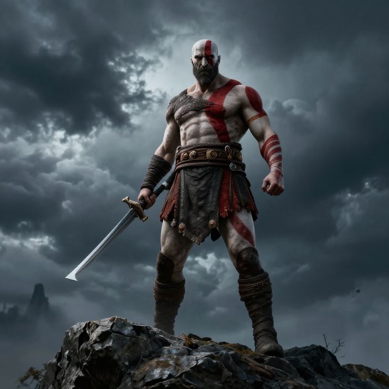 Kratos shirtless roaring in a fiery battlefield, scars and tattoos prominent, flames and smoke swirling around, dynamic pose, highly detailed digital art