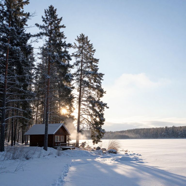 Photograph of a serene winter landscape at sunrise. A small, wooden cabin with a snow-covered roof sits to the left, partially obscured by tall, snow-dusted pine trees. The sun peeks through the trees, casting a warm glow across the snow-covered ground and reflecting off the frozen lake in the background. The sky is clear and bright blue, contrasting with the white snow. A narrow, snow-covered path leads to the cabin from the foreground, with shadows stretching across the snow. The scene is peaceful and picturesque, capturing the quiet beauty of a winter morning.