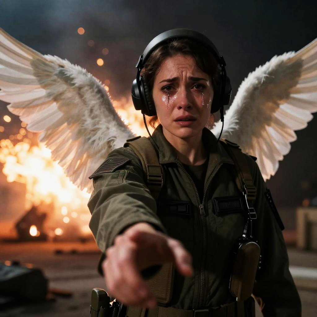 Robots, ANGEL WINGS, First-person perspective of the camera, Woman reaching out her hand towards the viewer, Worried and troubled expression on the woman's face, Sadness and tears in her eyes, Explosions and chaos in the background, Reflection of light's glow on her hair and the contours of her face and body, Woman dressed as a military pilot, Action-packed and dangerous atmosphere in the scene, Realistic details of the military attire and equipment, Emotionally charged and visually impactful composition, blurry lens, studio