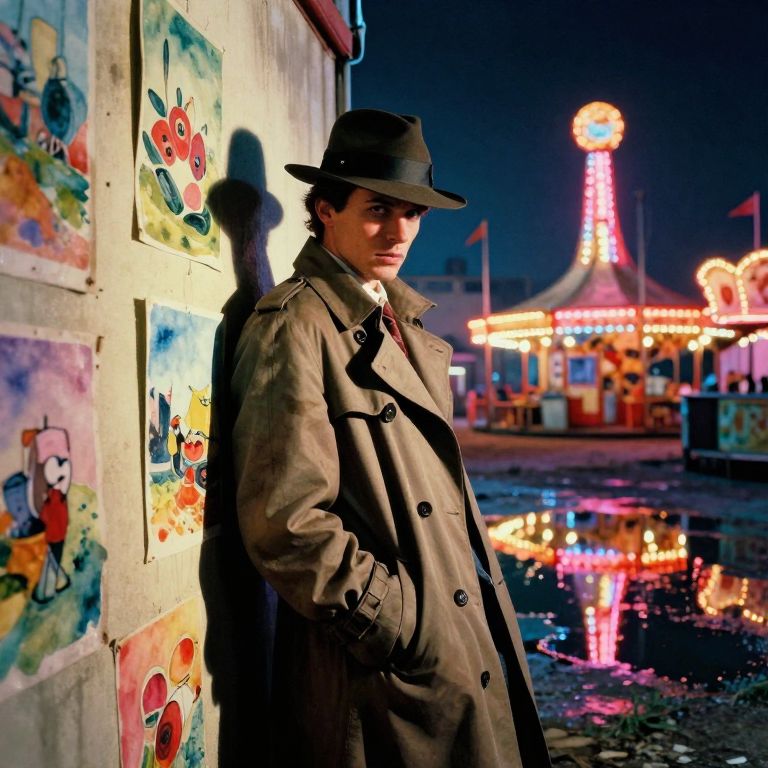 Create an image reminiscent of vintage film noir posters, portraying a surreal scene from a 'bug's-eye view' perspective. In this composition, a mysterious figure clad in a fedora and trench coat leans against a wall adorned with watercolor paintings. The background showcases an abandoned carnival midway under the dim glow of faded neon lights, exuding a sense of nostalgia and decay. The protagonist casts sharp contrasts of light and shadow on their face while the dreamlike quality of the watercolor reflections in puddles around them creates an emotional gradient that oscillates between suspense and fascination.