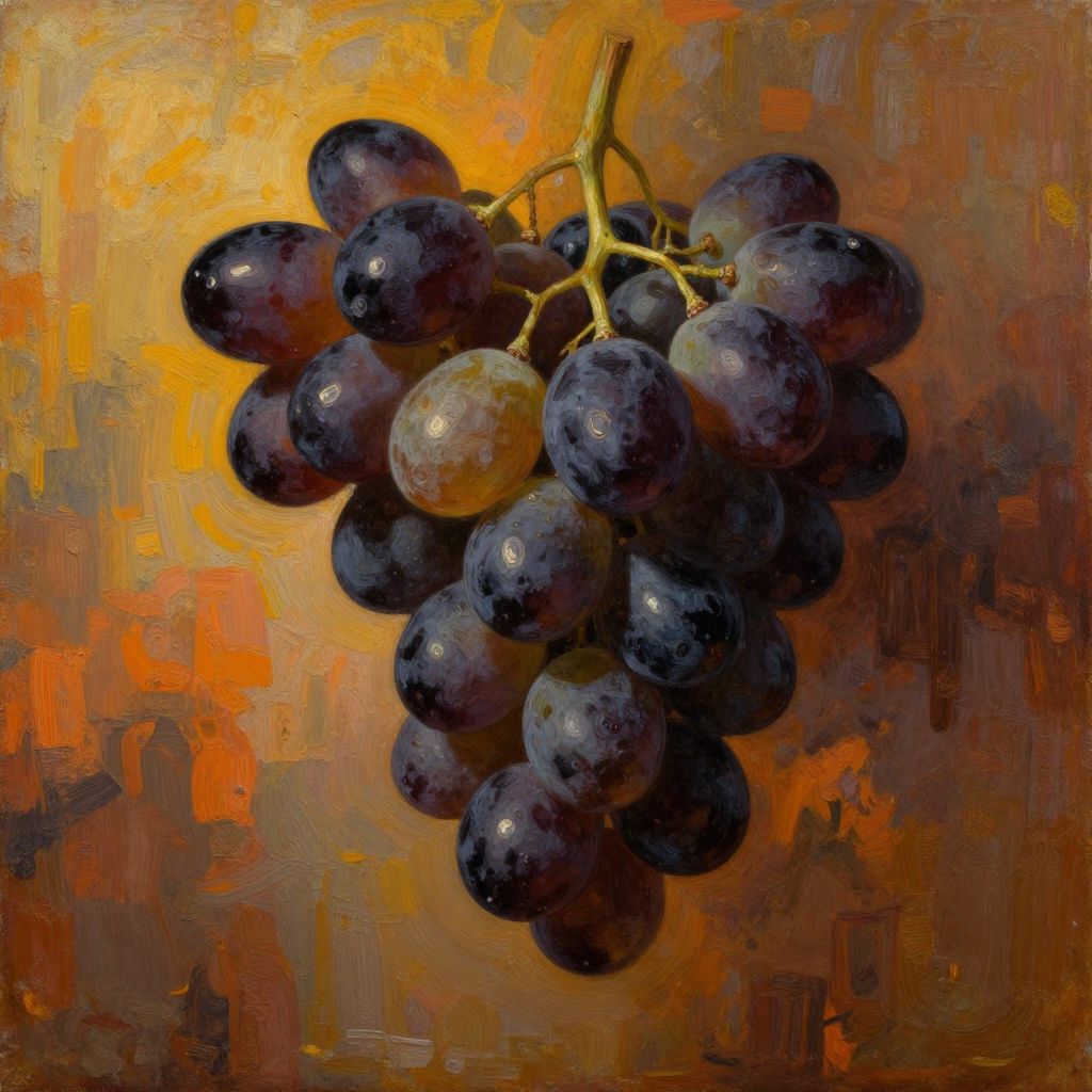 The image depicts a cluster of small grapes, rendered in an abstract, oil painting style that evokes a sense of warmth and gothic elegance. The grapes are depicted with a photo-realistic level of detail, showcasing their individual textures and subtle variations in color. The grapes range from dark, almost black hues to lighter, translucent shades, creating a striking contrast. The background is a vibrant, textured canvas with a mix of warm tones, including yellows, oranges, and browns, which enhance the overall atmospheric lighting and add depth to the composition. The grapes are arranged in a somewhat haphazard manner, with some grapes overlapping and others hanging loosely from their stems, giving the scene a dynamic and natural feel. The interplay of light and shadow on the grapes and the background creates a sense of depth and dimension, while the paint drips and brushstrokes add a sense of movement and texture to the image. The overall composition is balanced yet slightly off-center, drawing the viewer's eye to the cluster of grapes and inviting them to explore the intricate details and rich colors of this captivating artwork.