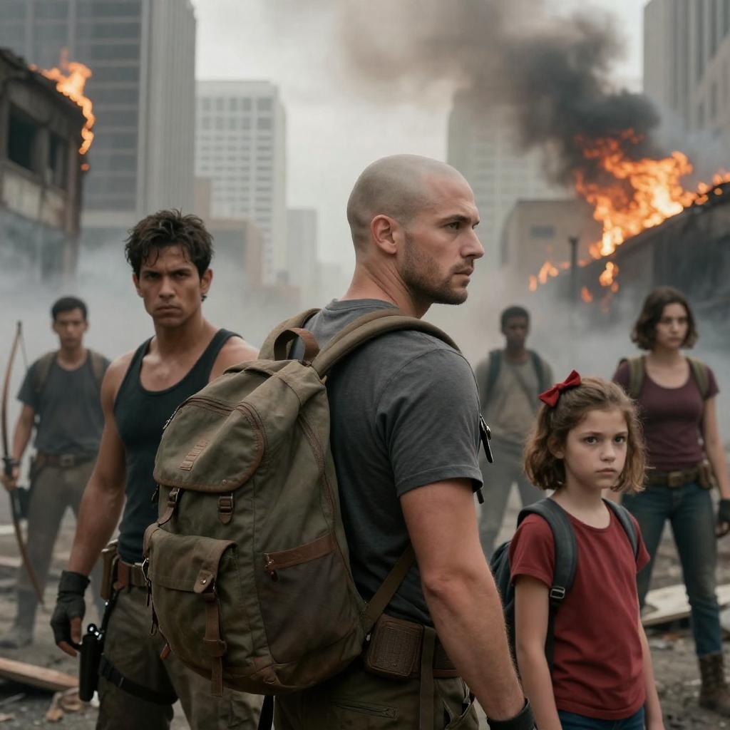 Photograph of five people in a post-apocalyptic cityscape with burning buildings. Central figure, bald with green backpack, faces right. To his left, muscular man with black tank top and serious expression. To his right, young girl with red shirt and bow, intense gaze. Background shows four other figures, one holding bow, amidst smoke and fire. Tall skyscrapers in the distance, partially obscured by smoke.