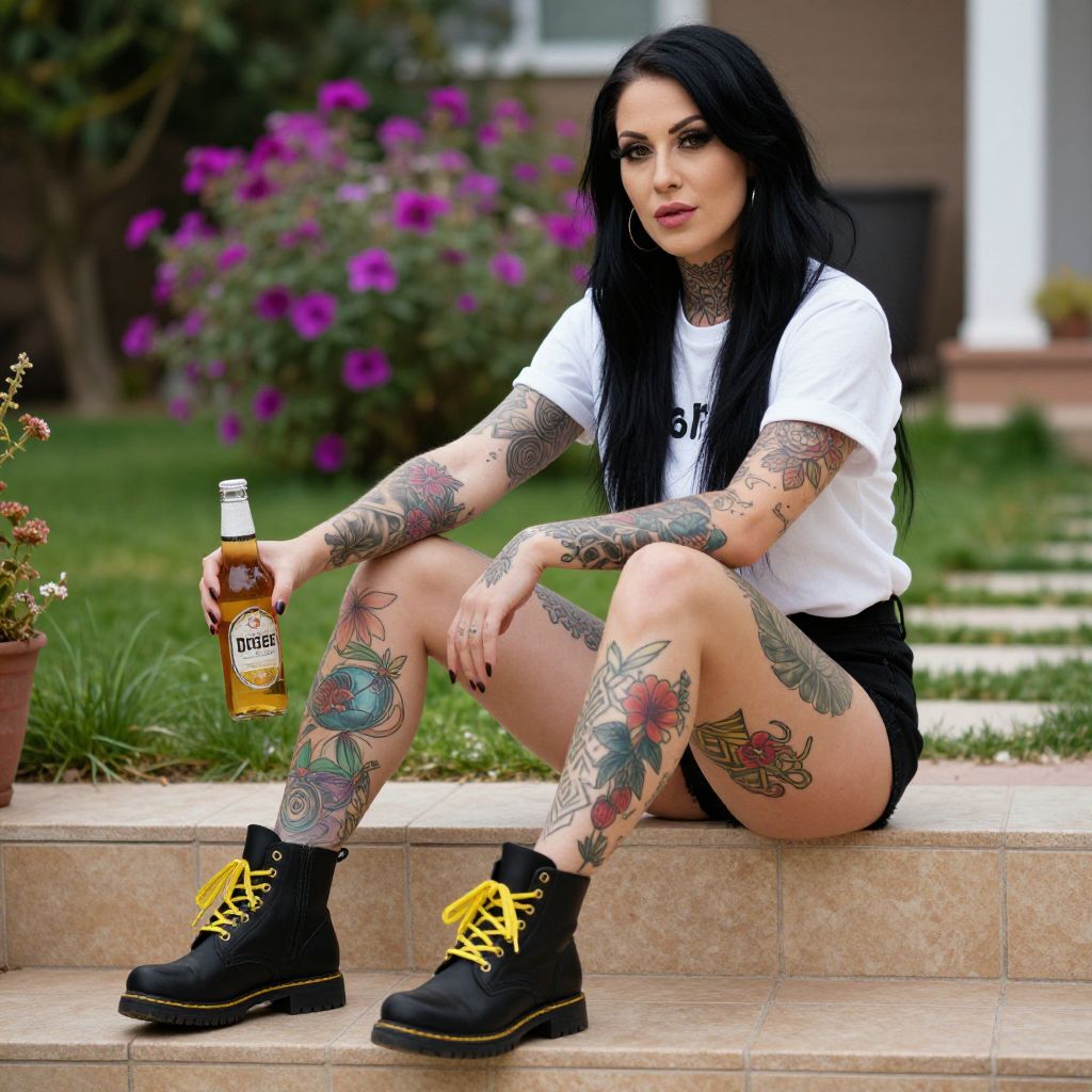 Photograph of a tattooed woman with long black hair, sitting on tiled steps in a garden. She's wearing a white t-shirt, black shorts, and black boots with yellow laces. Her arms and legs are covered in colorful tattoos. She's holding a bottle of beer in her right hand. The background has vibrant purple flowers, green grass, and a blurred house. She looks relaxed and confident.