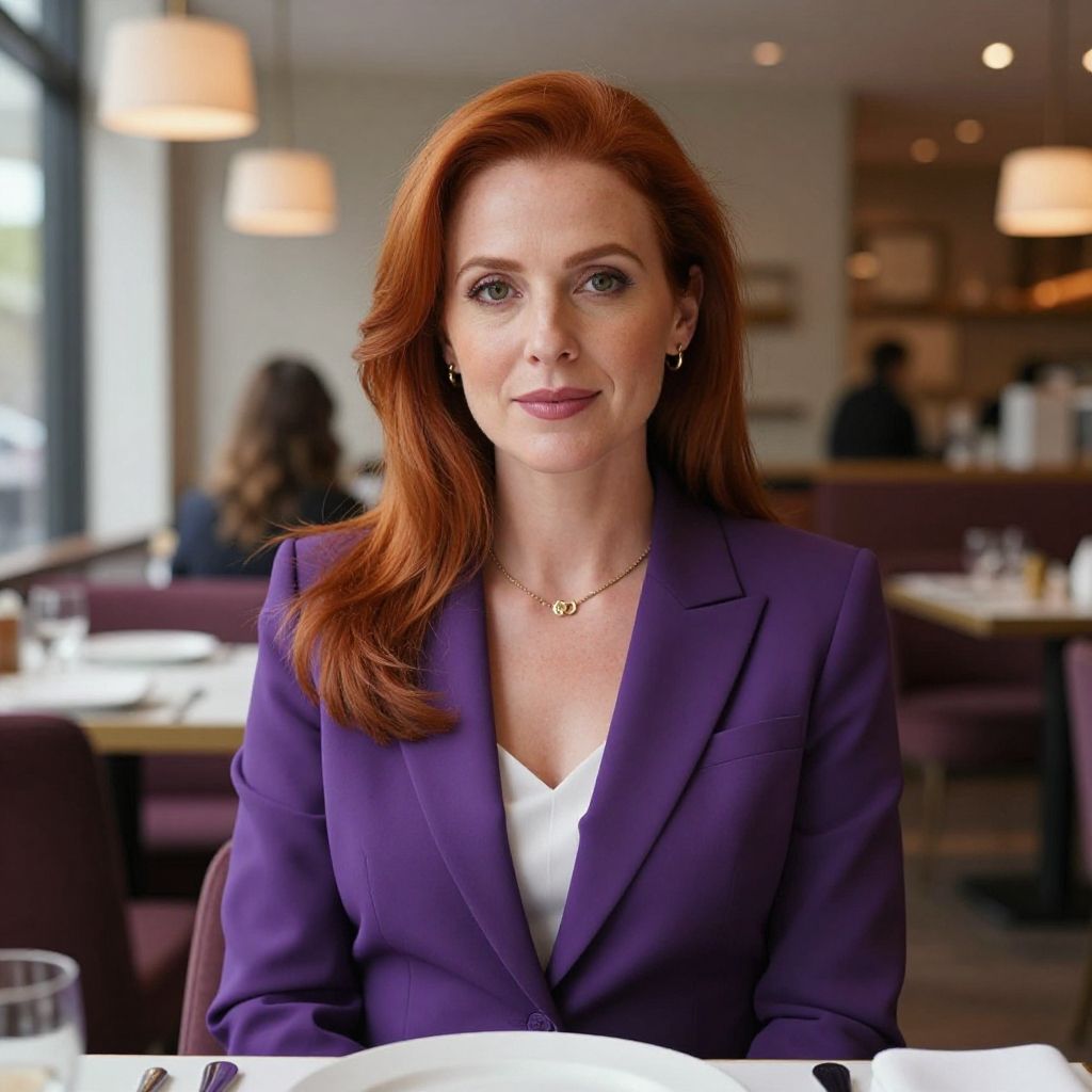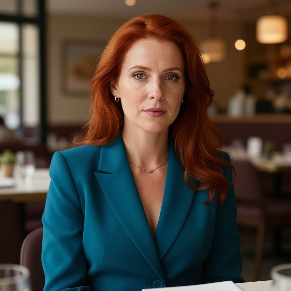 With red hair wearing a Baby Pink business suit, restaurant, 1girl, looking_at_viewer, photorealistic, realistic, solo, masterpiece, best quality, detailed face, g1873t, a woman, mature s1873s, red hair, long_hair