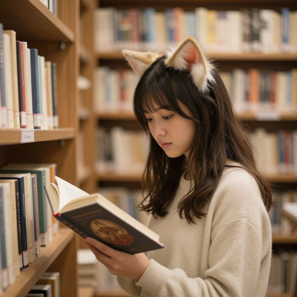 Photograph of a young Asian woman with cat ears, black hair, and white sweater, reading a book in a library.