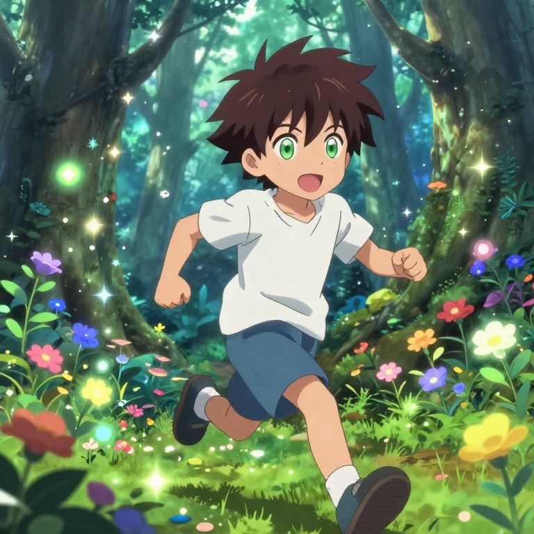 Anime-style drawing of a brown-haired, green-eyed boy in a white shirt and blue shorts, running through a vibrant, enchanted forest with glowing flowers and