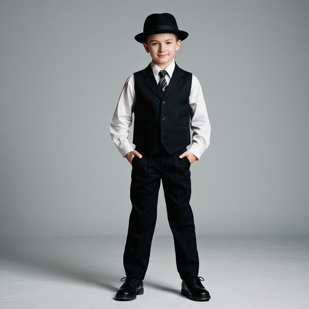 Tap dance outfit adults,1boy, solo, male focus, hat, shirt, vest, pants, white shirt, black pants, hands in pockets, black vest, realistic, full body, black headwear, black footwear, standing, looking at viewer, shoes, collared shirt, fedora