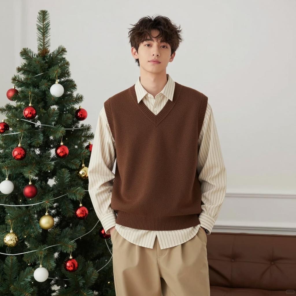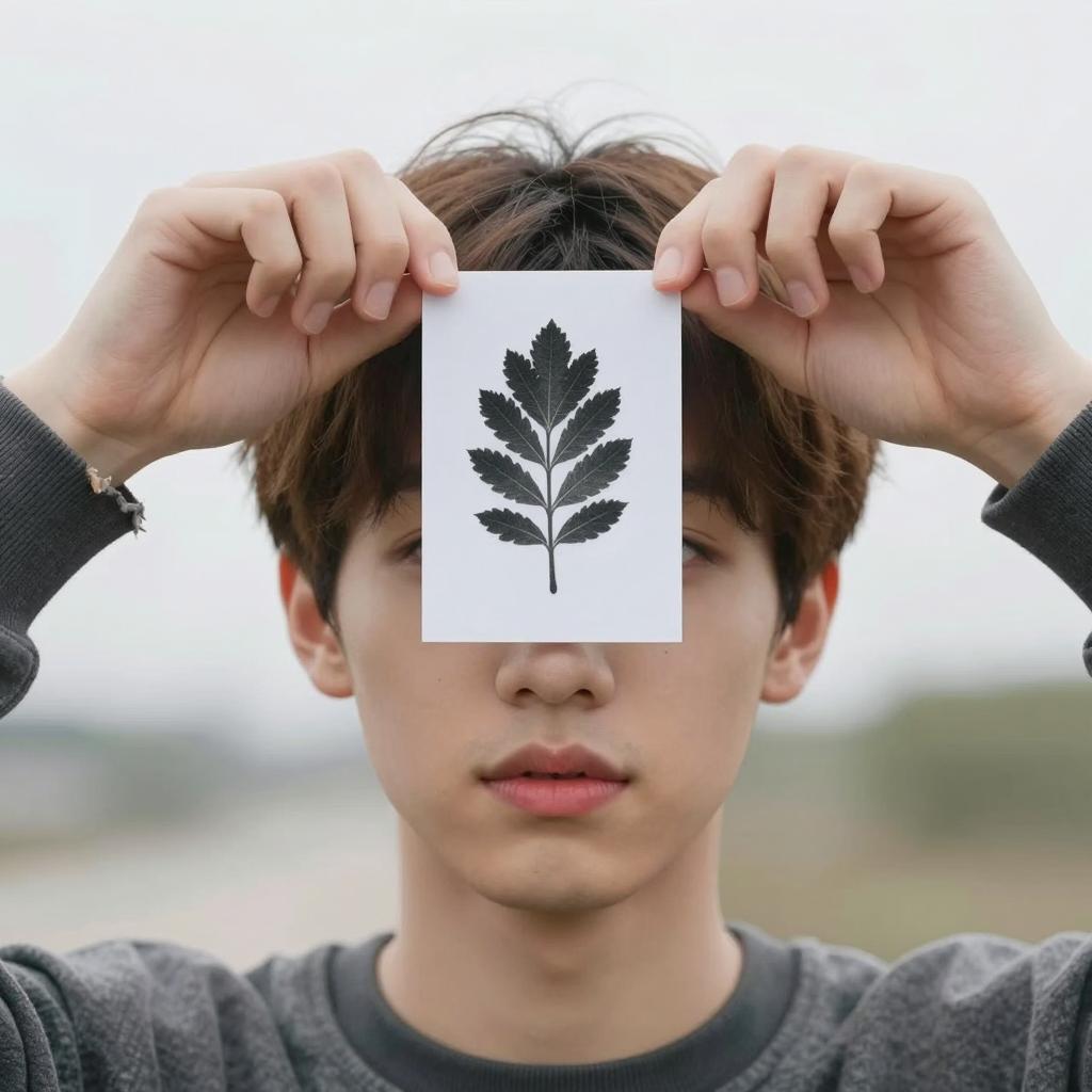 Young man with short brown hair, fair skin, and pink lips holds a card with a black leaf imprint over his forehead. Two hands with worn, striped sleeves frame his head from above. Bright background with blurred light.