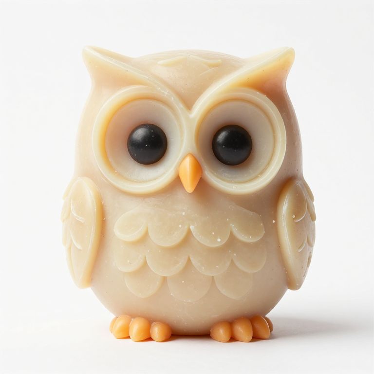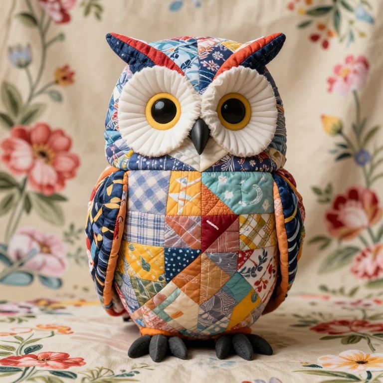 Colorful, quilted owl with blue body, green chest, red wings, orange beak and feet, large white eyes, on blue floral background