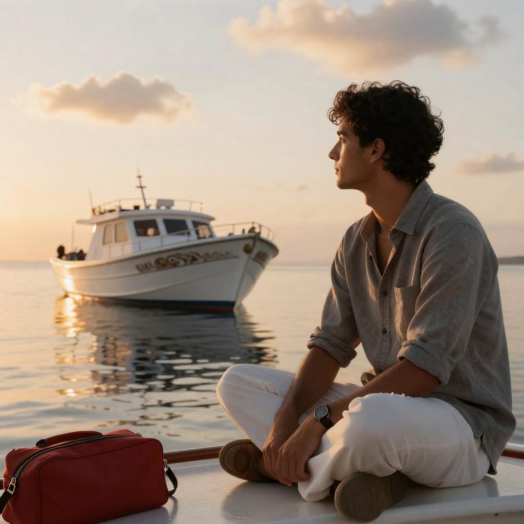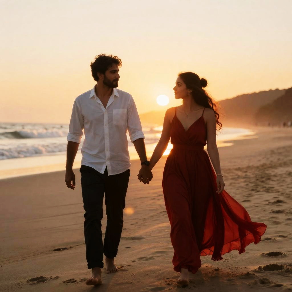 Photograph of three people on a beach. Central man with dark curly hair, white suit, holding hands with woman in red dress, leaning close. Woman in white dress walks behind. Sandy beach, ocean, hills in background. Casual, relaxed.