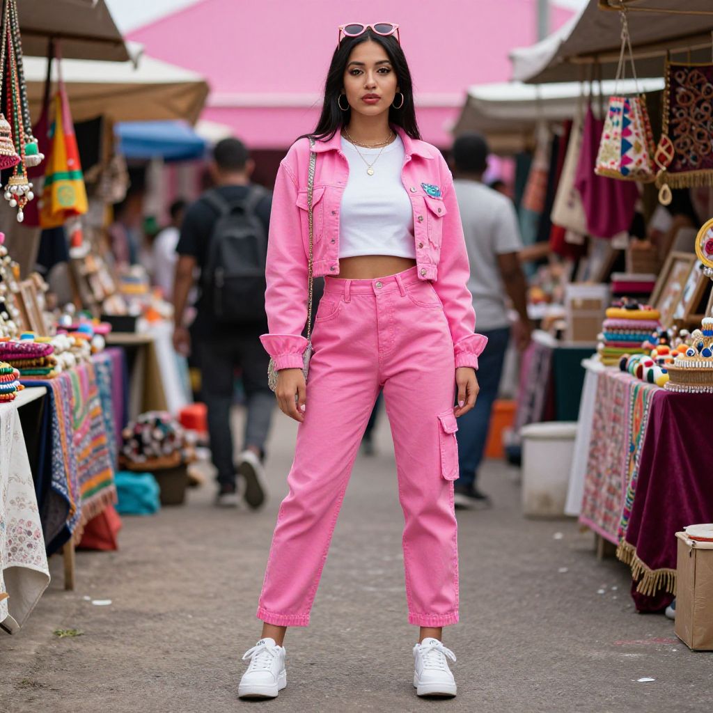 This vibrant image features a stylish woman dressed in a bold pink outfit, standing confidently in a lively market scene surrounded by colorful stalls. The eye-catching attire, complete with playful details, perfectly complements the energetic pink backdrop, creating a striking visual. The blend of fashion and vibrant culture highlights the essence of modern street style.