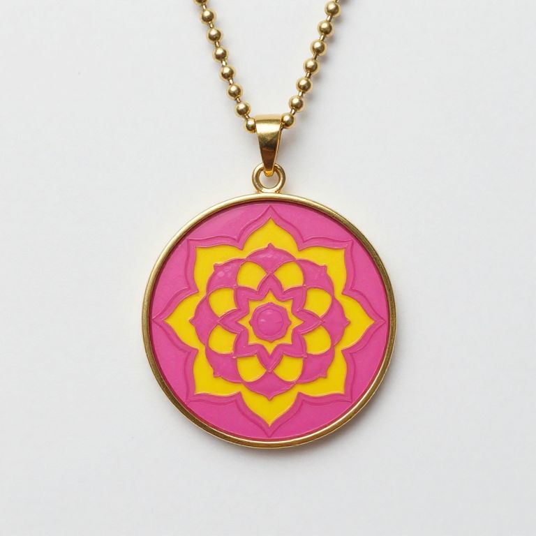 Circular pendant necklace featuring a vibrant pink and yellow mandala-style design encased in a gold frame, suspended by a chain of small metallic beads against a plain background.