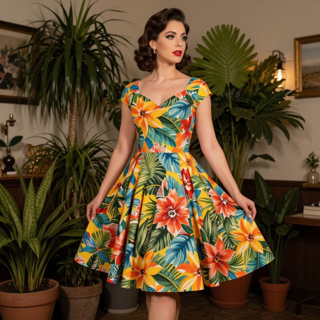 Photograph of a fair-skinned woman with dark, wavy 1950s-style hair, wearing a vibrant, short-sleeved, knee-length dress adorned with large, colorful tropical flowers in orange, yellow, red, and blue. She stands in a room with lush green potted plants, including palm fronds, and framed artwork on beige walls. The dress has a fitted bodice and a flared skirt, accentuating her hourglass figure. She wears bold red lipstick and subtle eye makeup. The room has a warm, vintage ambiance, with soft lighting highlighting the woman and her bright outfit.