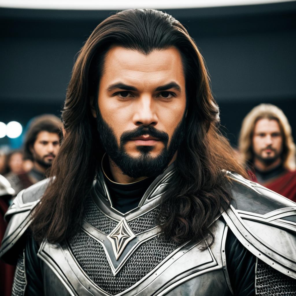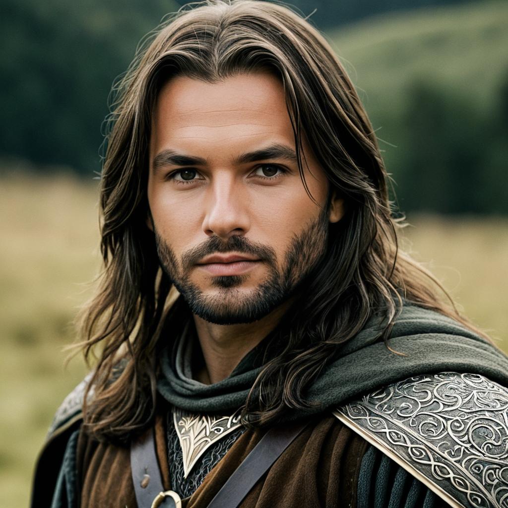 Lord rings costume aragorn,solo, 1boy, male focus, facial hair, realistic, long hair, beard, brown hair, blurry background, blurry, upper body, outdoors, looking at viewer, closed mouth