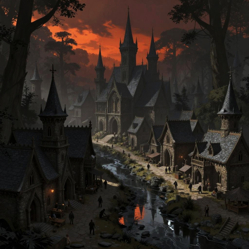 (dark fantasy art:1.3) by Greg Rutkowski and Brom, cinematic, digital art, volumetric lighting, dynamic shadows, deep focus, digital matte painting, dark fantasy architecture, medieval village, forest, nature, town square, people at work. colors of black grey and orange (in a red sky:0.5), dark spires with sharp edges and (high contra BREAK 1.3) A highly detailed digital illustration of a medieval (dark fantasy:1.3) village nestled in the heart of a dark forest. The setting is adorned with mud and stone, shadow and grief, and towering trees that provide shade from the sun. The village itself boasts stunning architecture; each building is meticulously crafted with . A polluted stream meanders through the center of town, glistening with water as it reflects the village around it. Inhabitants of this place can be seen going about their daily lives: blacksmiths working at their forges, and people in the cobblestone streets. In the distance, a castle stands tall, its spires reaching towards the sky.