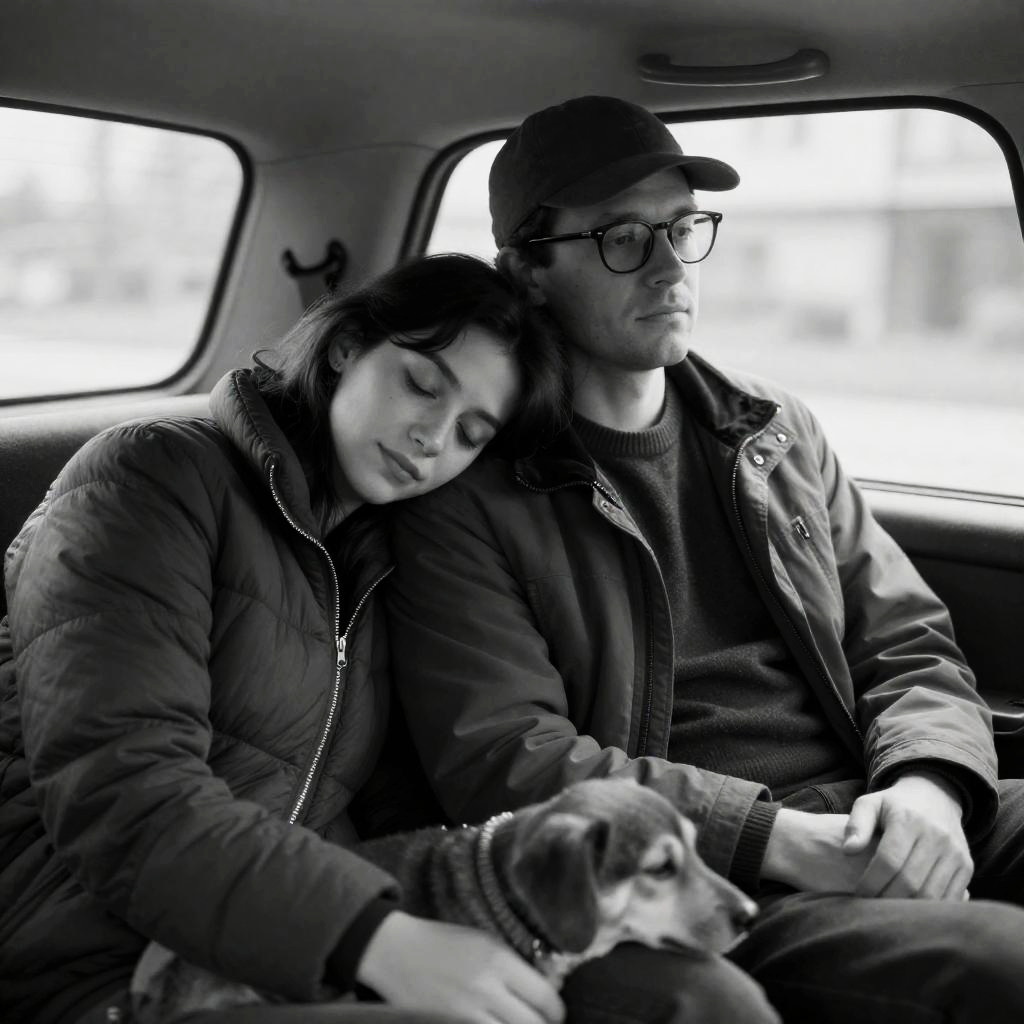 Black-and-white photograph of a man and woman in a car. The man with glasses, a hat, and a jacket sits stiffly, wearing a sweater. The woman with dark hair leans on his shoulder, eyes closed, wearing a quilted jacket. A dog rests on her lap. The woman's head is nestled close to the man's, her arm around his neck. The car's windows show a blurred exterior. Both expressions are calm. The man's left hand rests on his lap.