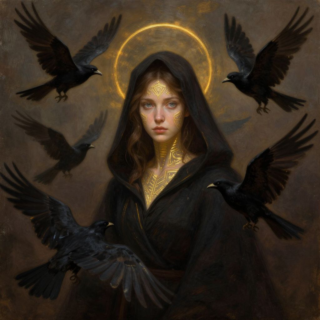 This is a digital painting in a realistic, semi-abstract style, flawless composition, The central figure is a young woman with fair skin and soft light brown hair that frames her serene, contemplative expression, Her striking light blue eyes are captivating, while her face and neck are adorned with intricate golden geometric patterns, evoking a mystical and otherworldly presence, A radiant golden halo floats above her head, further emphasizing her ethereal quality, She is cloaked in a dark hooded garment, its shadows partially obscuring her features and adding an enigmatic depth to her aura, Surrounding her are several black birds in mid-flight, their wings spread wide in dynamic arcs, creating an interplay of motion and mystery, The muted, earthy brown background is softly blurred, blending seamlessly into the composition and allowing the figure and birds to command focus, The golden patterns on her skin and the birds' wings are illuminated by a warm, golden glow, providing a striking contrast to the darker tones of her attire and the subdued background, The skillful interplay of light and shadow, combined with the abstract yet symbolic elements, creates a hauntingly surreal atmosphere that draws the viewer into the figure's enigmatic presence, This painting seamlessly fuses fantasy and realism with ancient symbolism and modern digital artistry