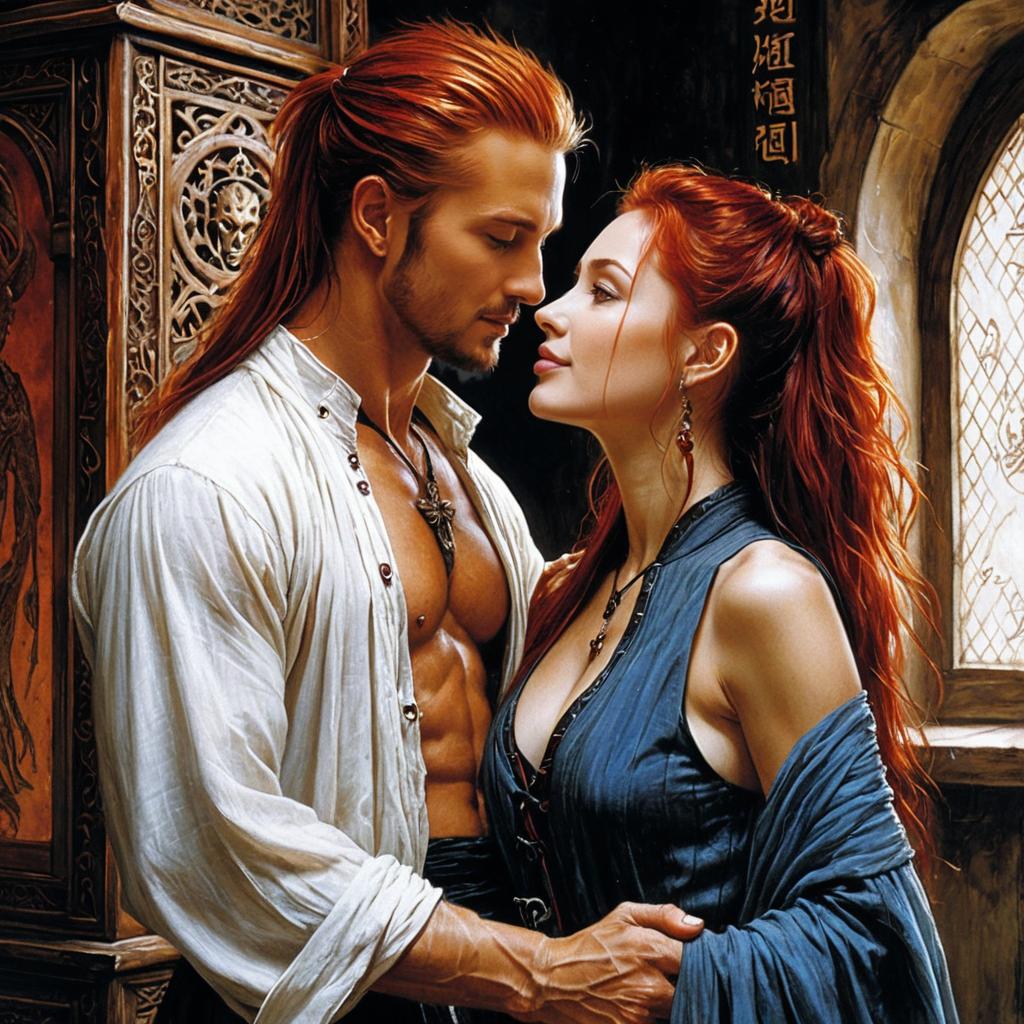 Chinese Art Fantasy art drawn by Luis Royo: handsome siren with ice blue eyes, braided platinum hair, handsome domineering devil man, cruel smile, unbuttoned shirt, beautiful athletic torso, blue eyes, a teacher at the magic academy, a glowing phoenix perched above the shelves, kiss, hugs, books, magic, scrolls, magic cabinet, haze, drawn by luis royo,