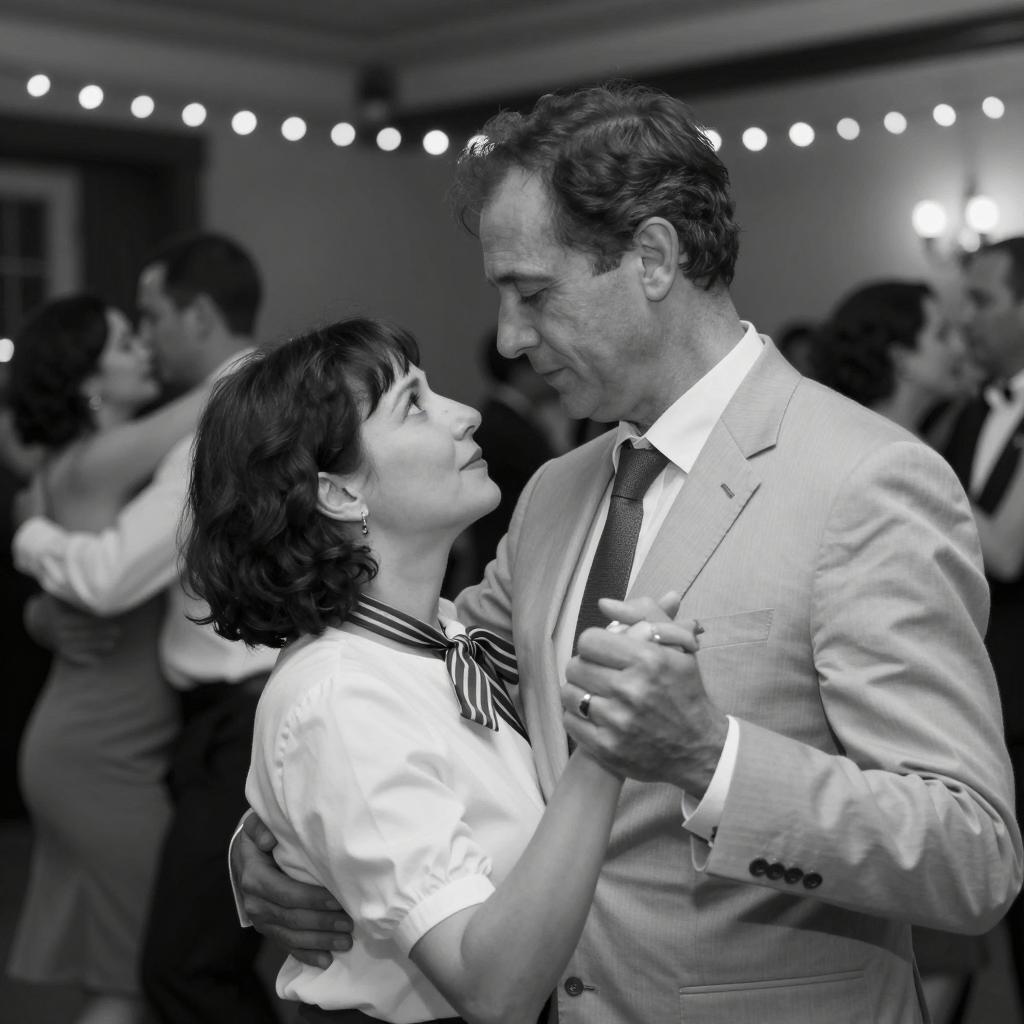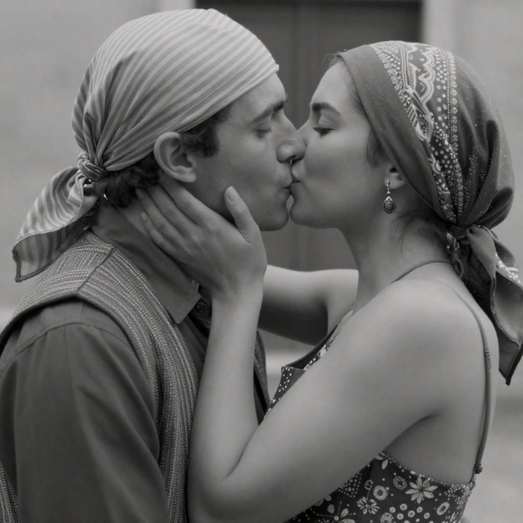 Black-and-white photograph of a passionate kiss between two people. Man with striped headscarf and patterned vest, woman with patterned headscarf and sleeveless dress. Woman's eyes closed, man's eyes focused. Woman's left arm around man's neck, man's right hand on woman's head. Intimate, close-up shot. Background blurred.