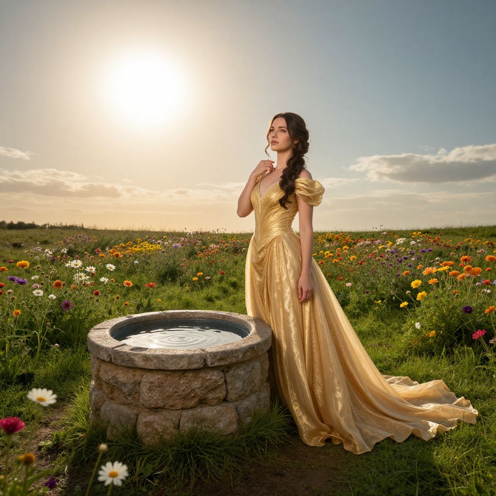 Photograph of a woman in a golden, flowing gown standing by a stone well in a sunlit meadow with colorful flowers.
