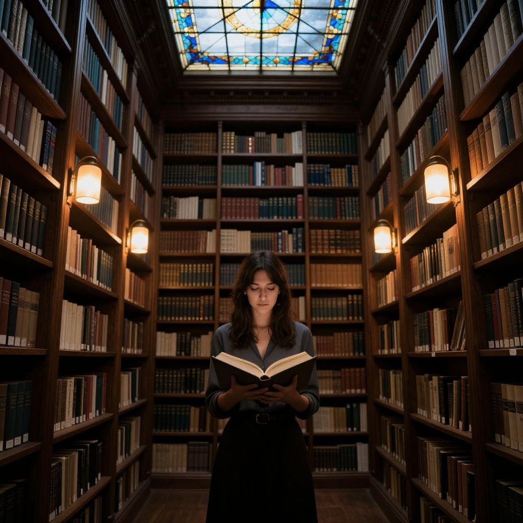 Immersed in a grand, dimly lit library, a woman stands centrally, holding two open books while surrounded by towering wooden shelves filled with countless volumes, warm ambient lighting casting soft glows from wall-mounted fixtures beneath a large stained-glass skylight overhead.