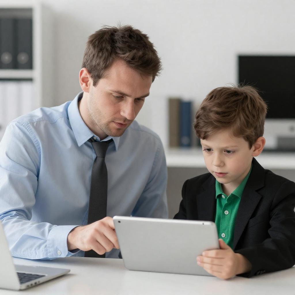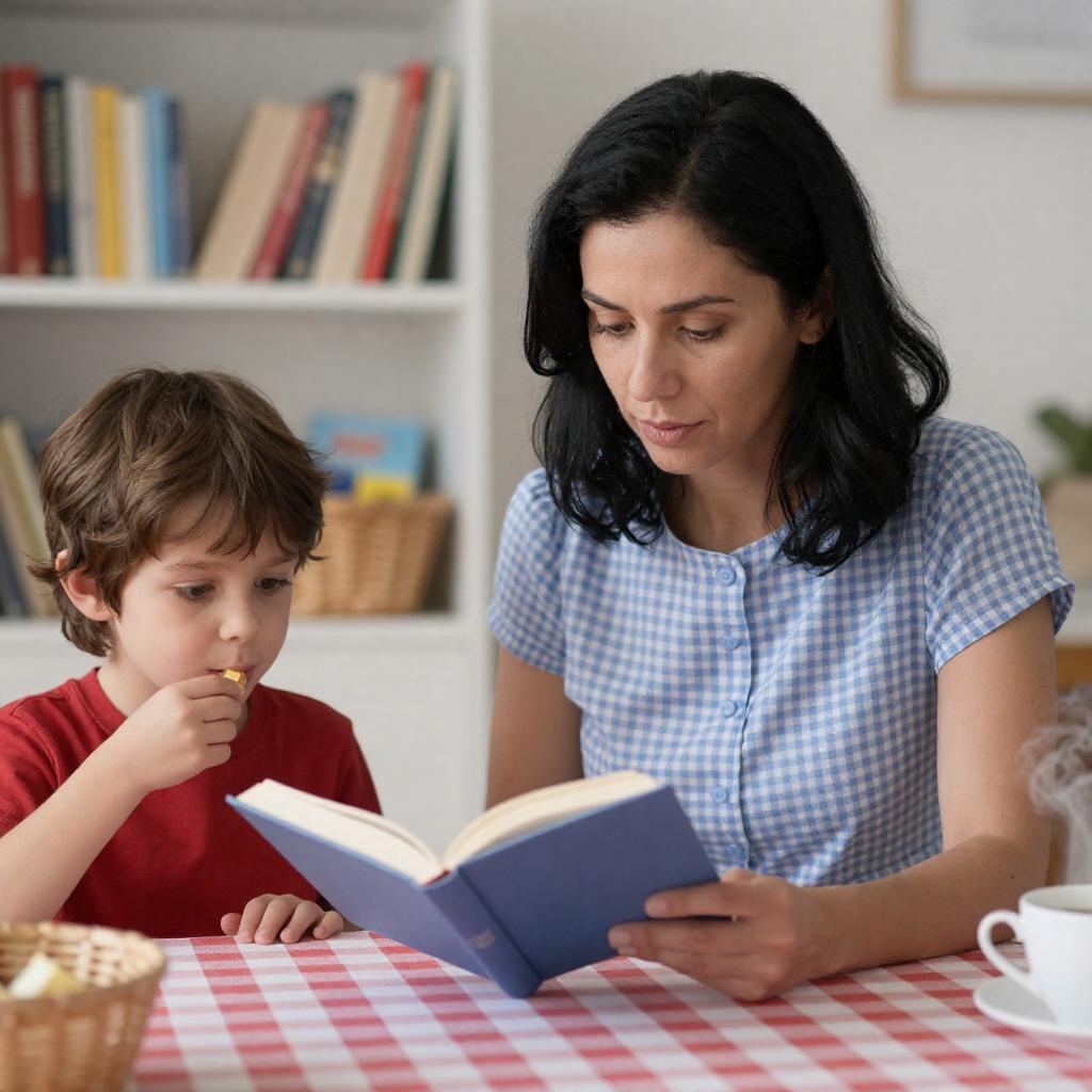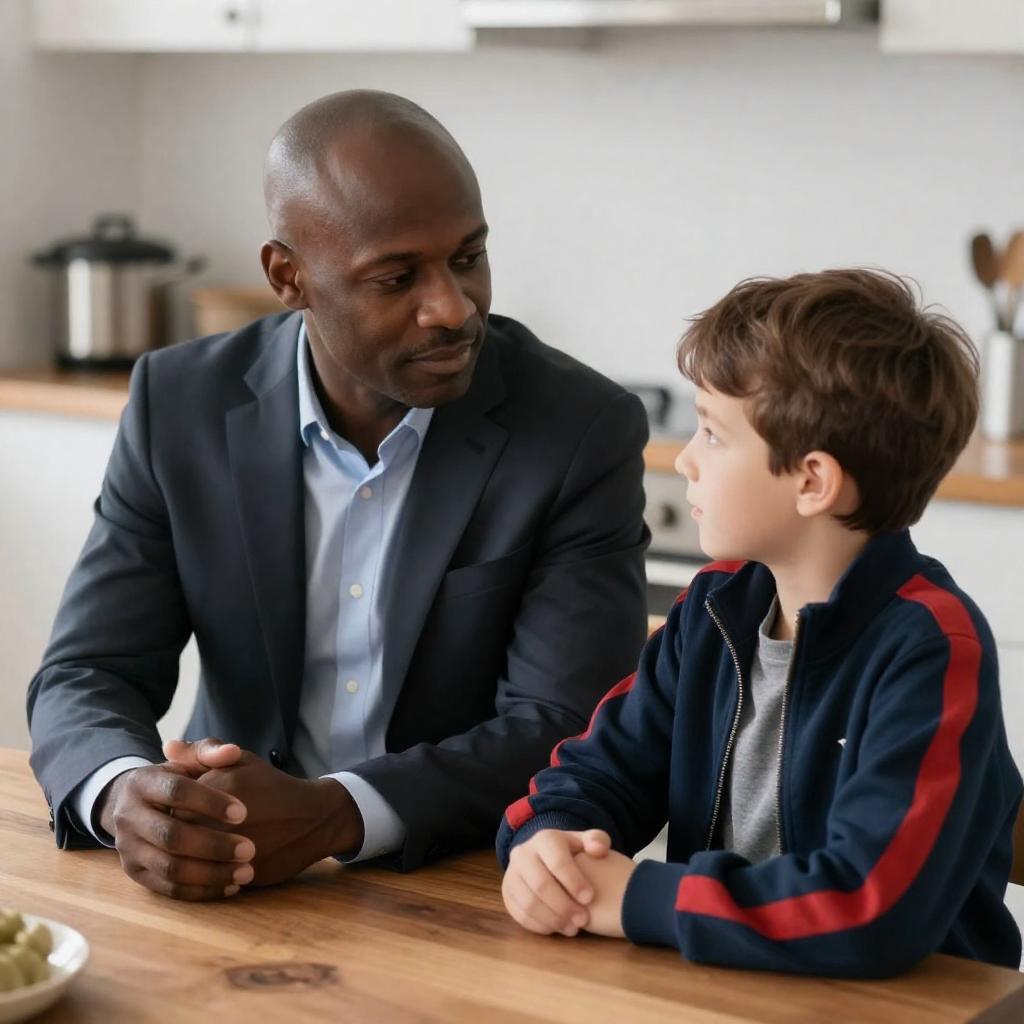 Photograph of a middle-aged man with brown hair and a light blue sweater, sitting across from a young boy with blond hair in a green and blue sweater, at a dining table. The man is holding a fork over a plate, looking at the boy. Background includes a white shelf with books, a TV, and potted plants.