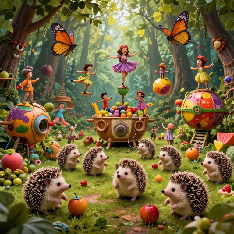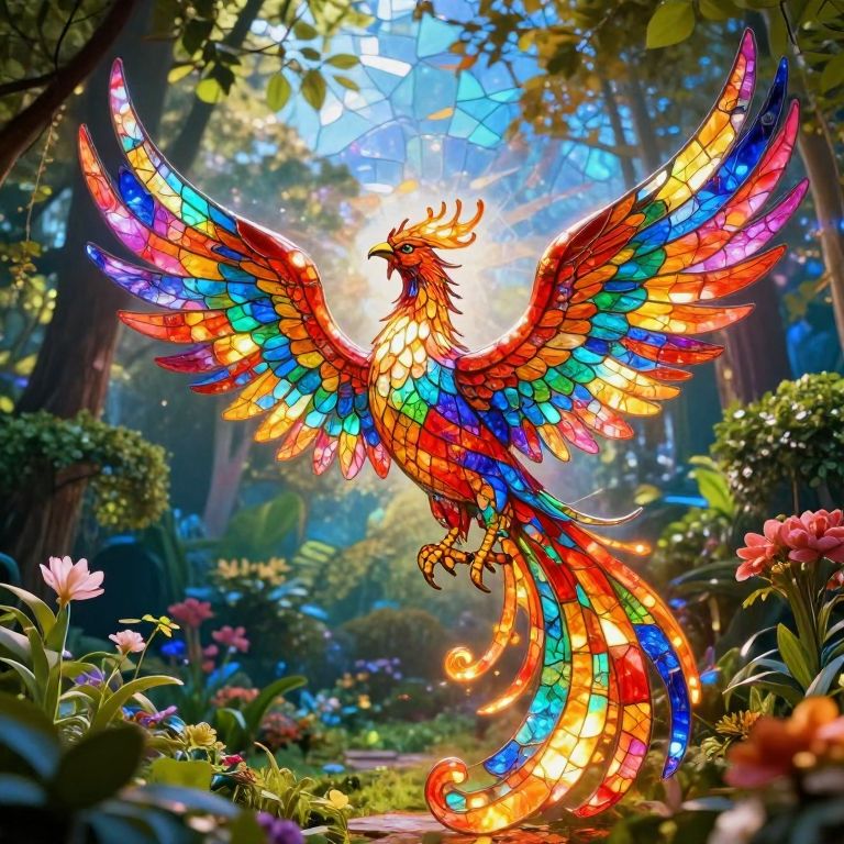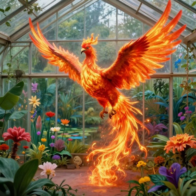 Craft an image showcasing a surreal and intricate garden in vivid hues, where mythical beings coexist harmoniously with commonplace flora and fauna. The vantage point is from above, offering a panoramic view of the fantastical landscape's complex interplay. In the foreground, a majestic phoenix glides gracefully over lush blossoms, while in the background, an assortment of quirky, anthropomorphic woodland creatures engage in peculiar pursuits, creating an enchanting atmosphere brimming with symbolism and allegory.
