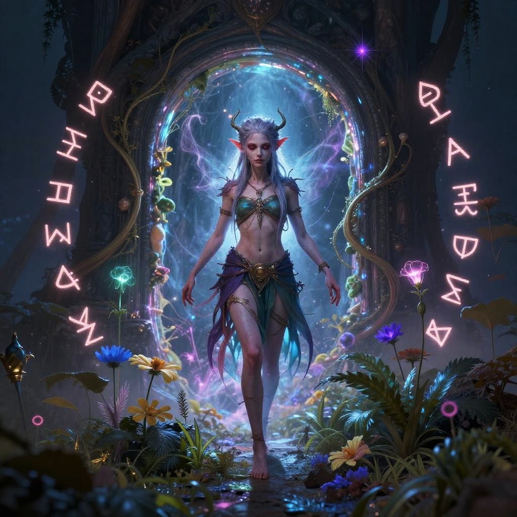 Changeling fantasy art showing a mysterious changeling figure emerging from a shimmering portal, blending elements of human and otherworldly features, surrounded by floating runes and enchanted flora, dramatic lighting, vibrant magical aura, highly detailed fantasy setting.