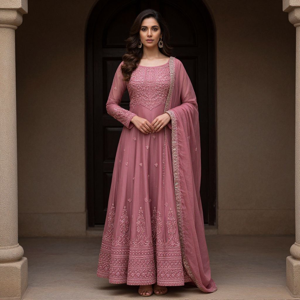 Elegant woman wearing a Dusty Rose Anarkali Set with intricate embroidery and sheer sleeves, standing gracefully in front of a dark arched door framed by stone columns.