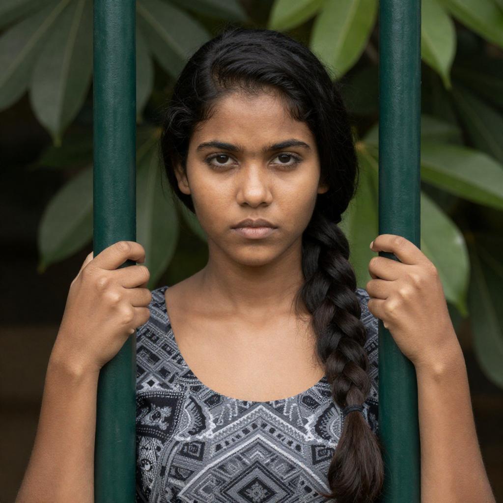 Young girl with dirty, wet hair and mud-stained clothes, leaning on a wooden table, looking to the side with a serious expression. Dark, dimly lit background with blurred objects. She has light brown skin and a contemplative look.