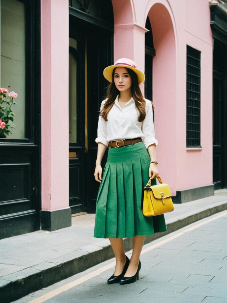 A stylish woman standing outdoors on a city street wearing a white button-up shirt, high-waisted green pleated skirt, black high-heeled shoes, and a yellow hat decorated with a large pink flower. She carries a matching yellow handbag and has long brown hair. The background features a building facade and flower planters.