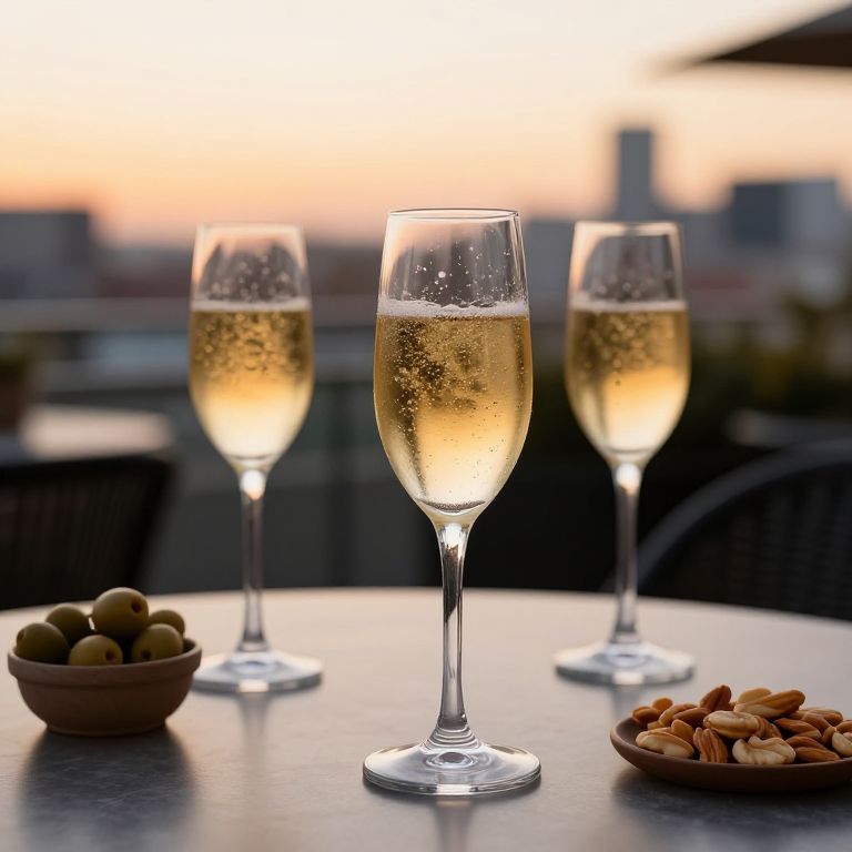 A stylish apéritif moment captured on a terrace at sunset, showcasing crystal glasses filled with golden sparkling wine and light snacks like olives and nuts, warm soft light bathing the scene, sophisticated and serene vibe with a city skyline fading gently behind.