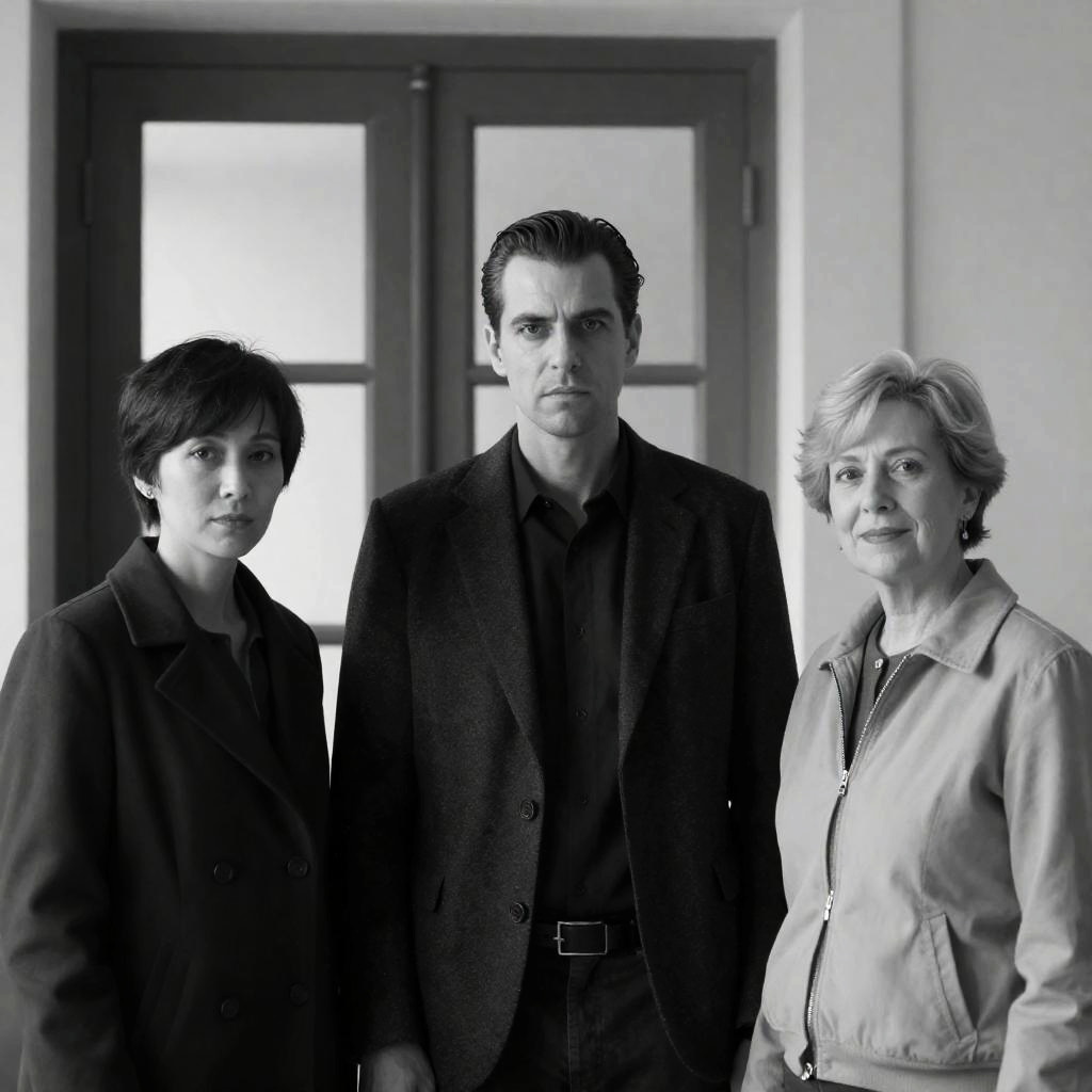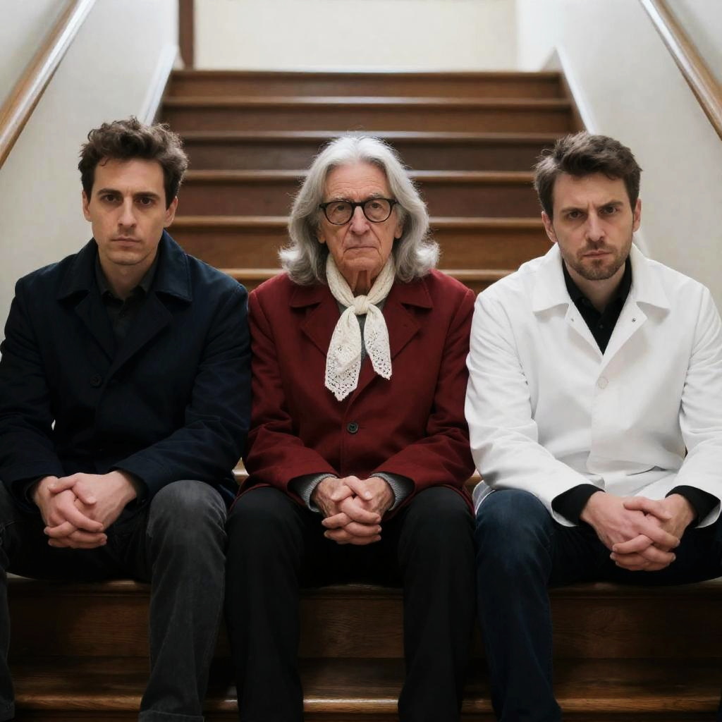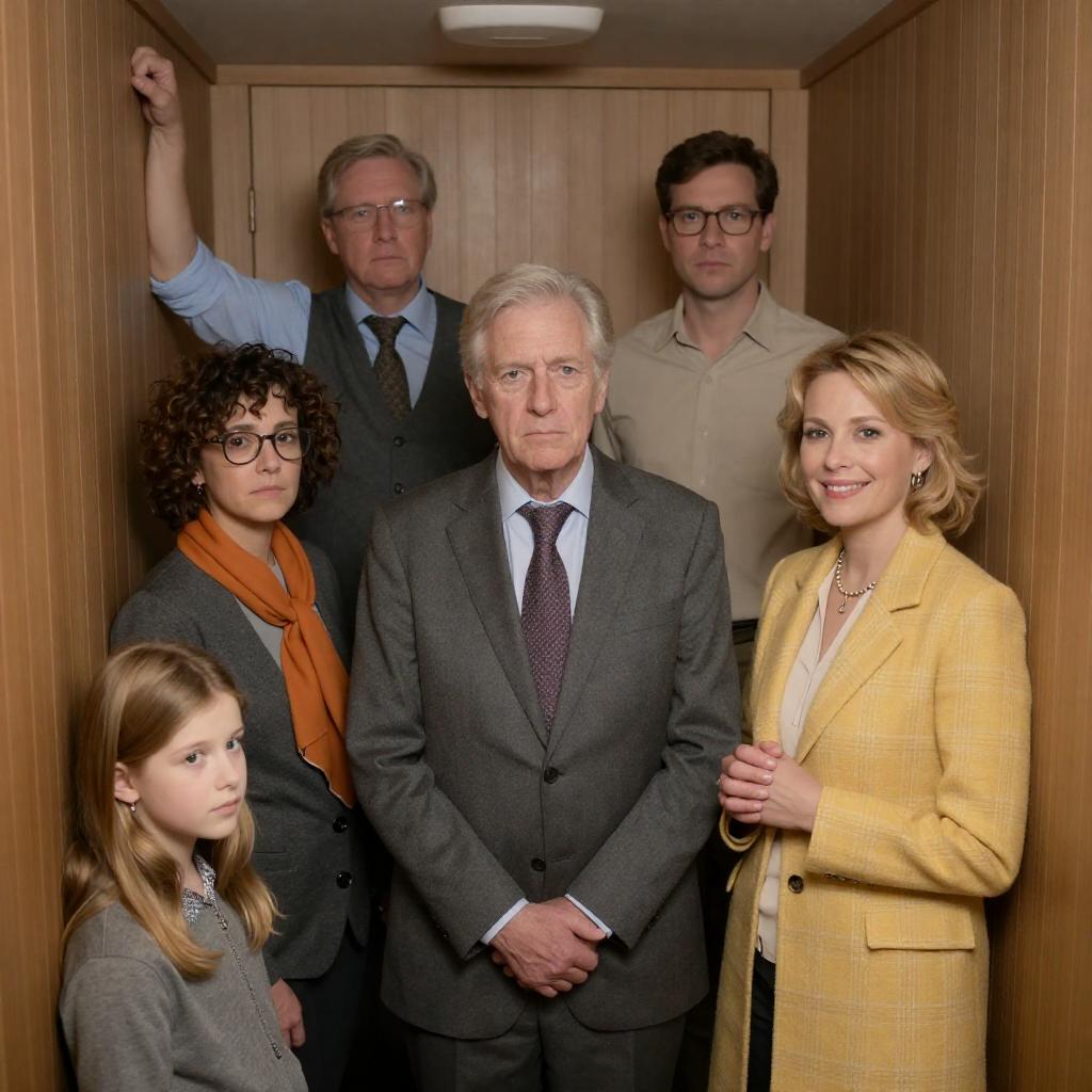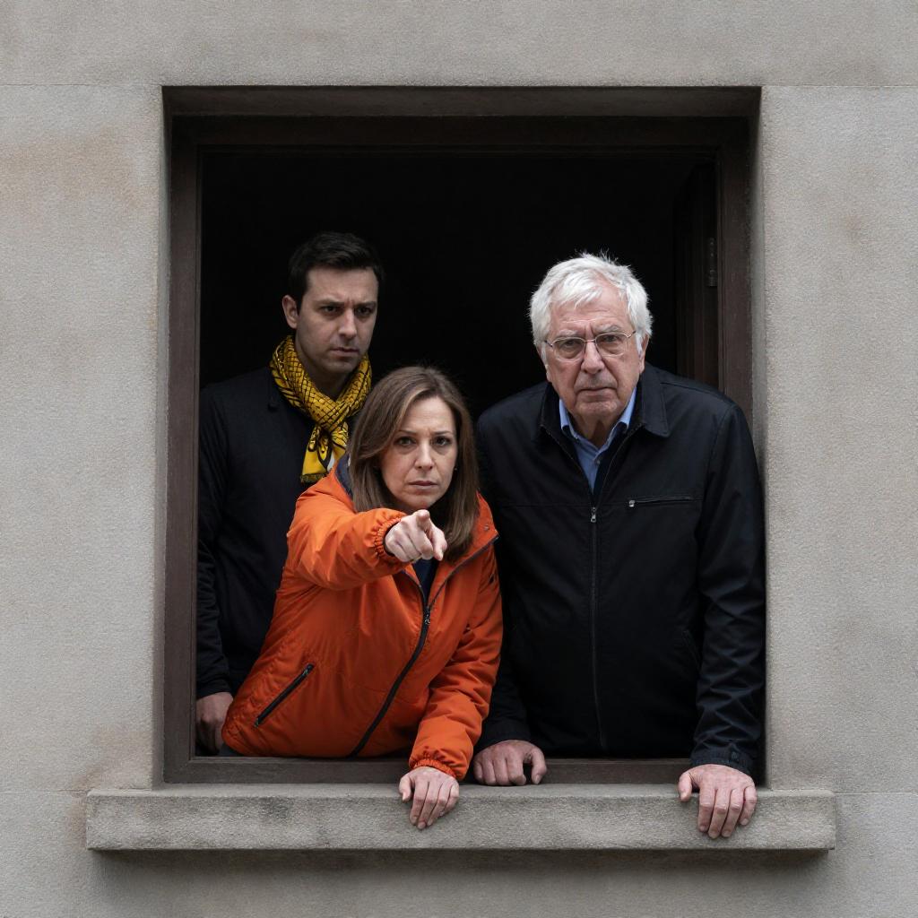 Three people leaning out of a rectangular window. The woman in front wears an orange jacket, has brown hair, and points forward. The man behind her has short dark hair, wears a yellow and black patterned scarf. An older man with white hair, glasses, and a black jacket stands to the right. Gray stone wall background. All expressions are intense and focused.