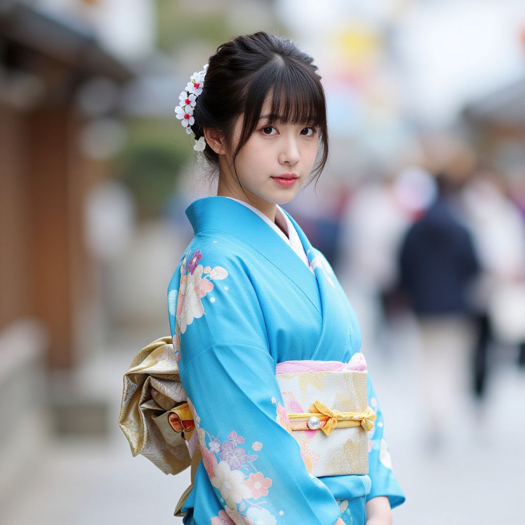 Elegant Japanese Girl in Blue Kimono