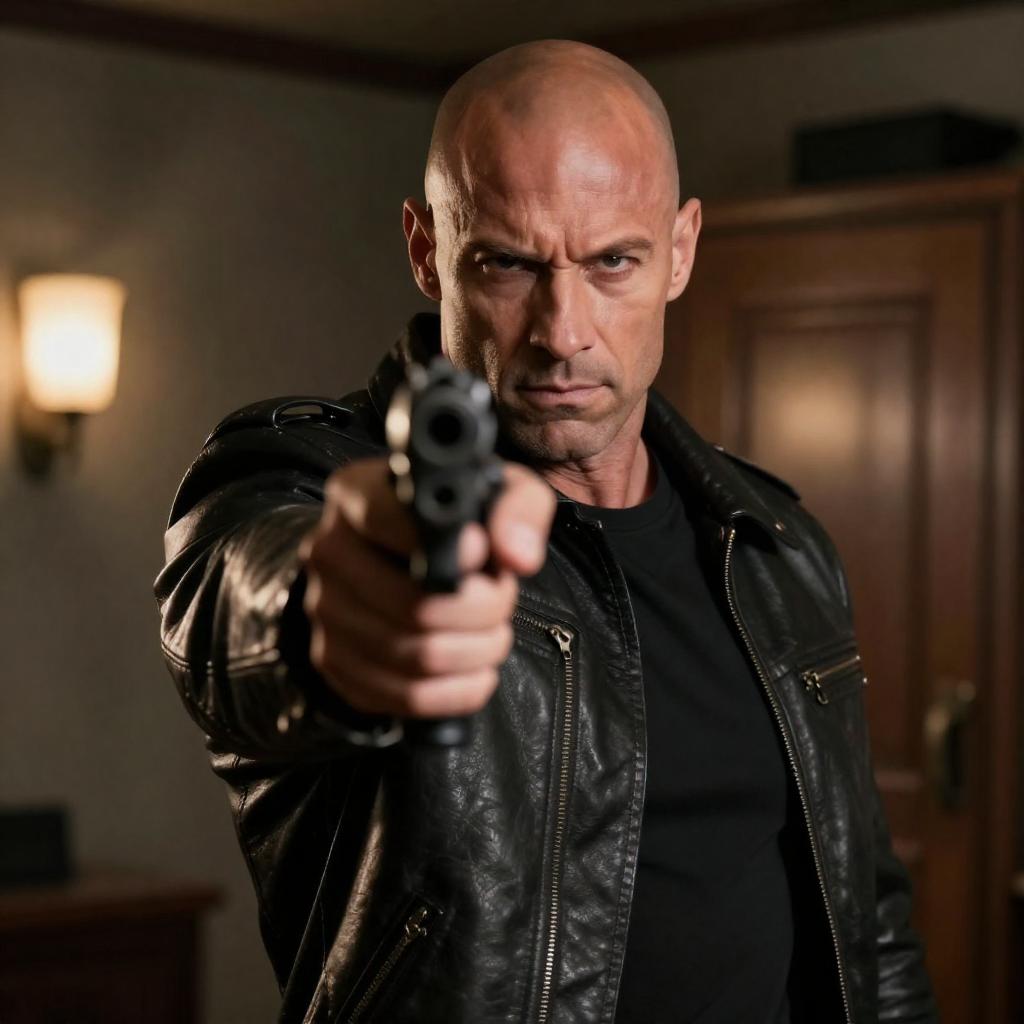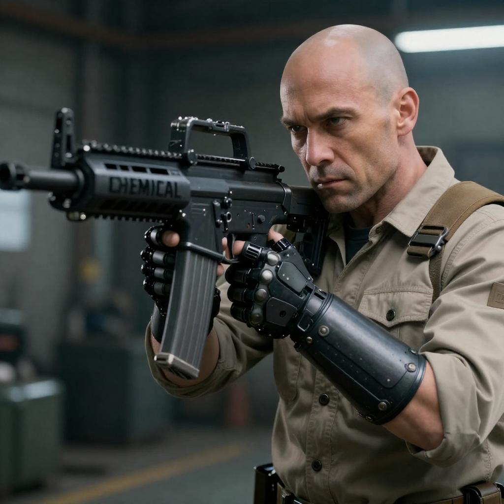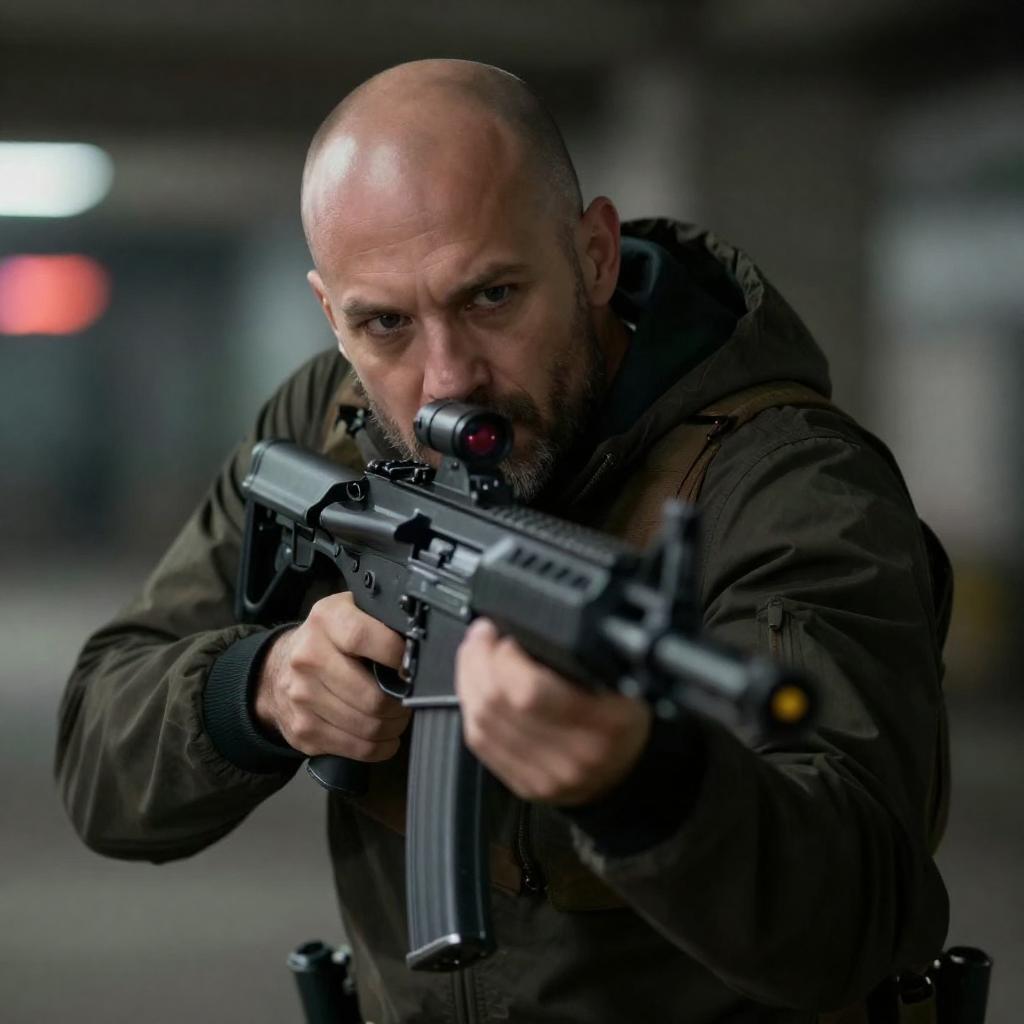 Bald Muscular Man Aiming Futuristic Gun