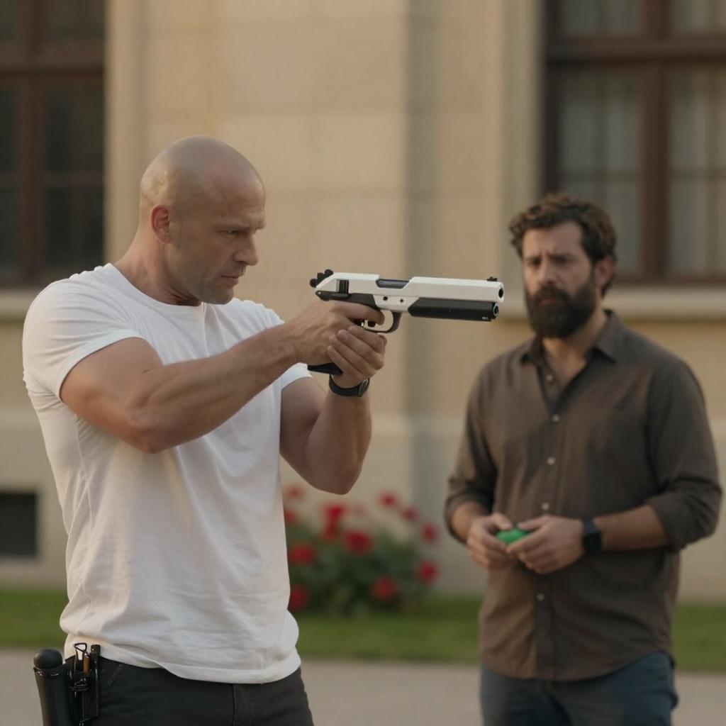 Photograph of a bald, muscular man in a white t-shirt aiming a futuristic, white and black gun at a bearded man in a brown shirt holding a green object. They stand in front of a tall, stone building with yellow lighting and red flowers in the background. The bearded man looks concerned.