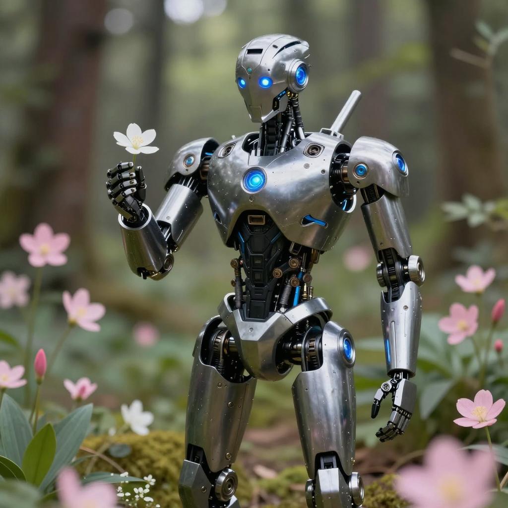 A highly detailed metallic robot with glowing blue eyes and intricate armor design stands in a lush forest surrounded by vibrant foliage and pink flowers. The robot is holding a delicate white flower, blending technology with nature in a serene woodland setting.