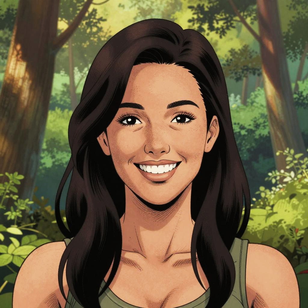 Comic artwork of woman, portrait, smiling, happy, forest background, daylight warm summer day, crosshatching, 2D, Sharp, Detailed, HD, HDR, High Quality, High Resolution, Masterpiece