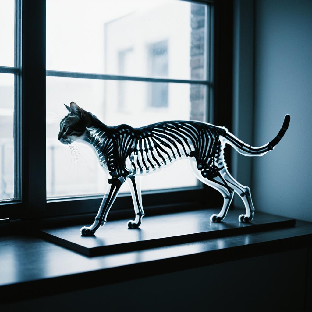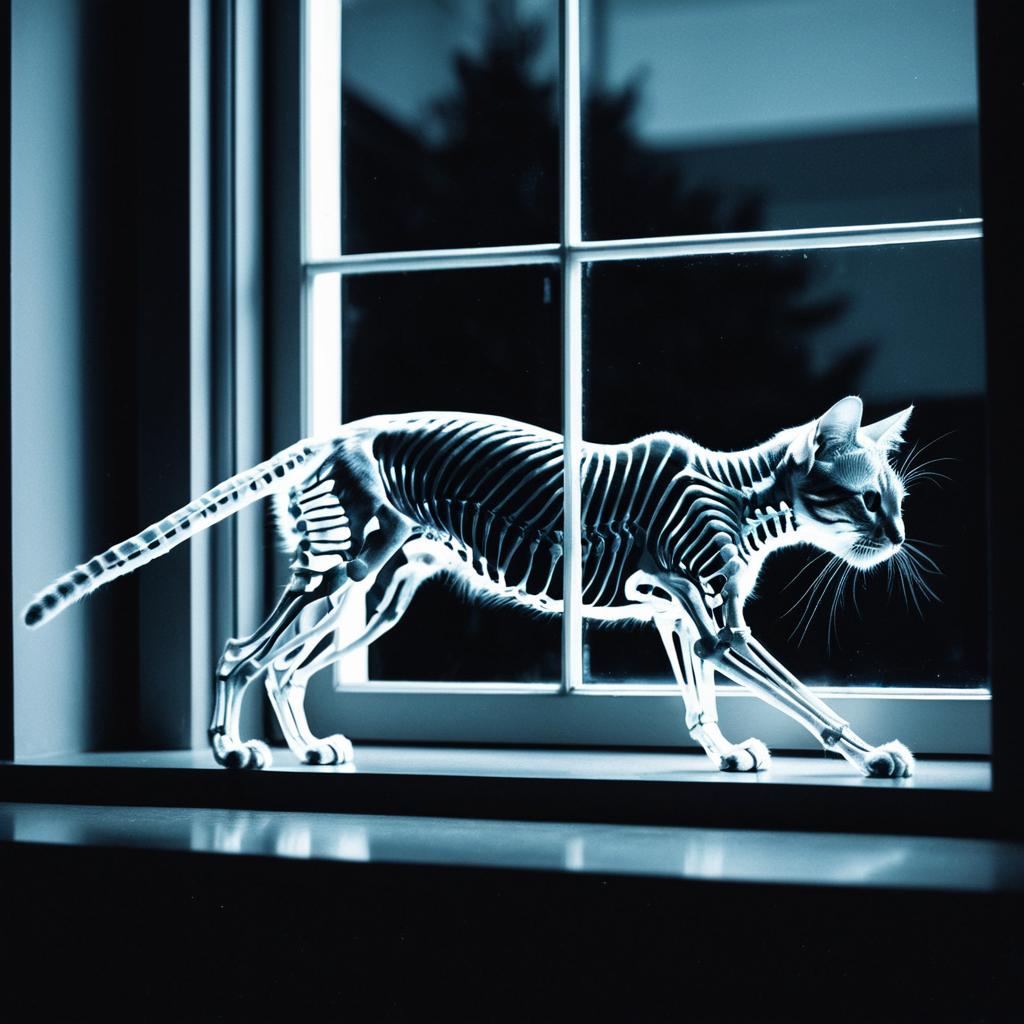 X-Ray artwork of a cat stretching on a windowsill, an indoor soft-focus room backdrop, detailed skeletal structure with soft luminescent accents