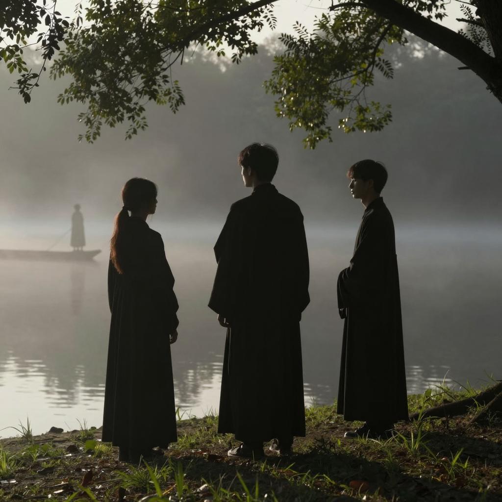 Silhouetted group of 12 people walking away from bright blue light on wooden floor. Most wear white or light-colored pants and shirts, some in dark clothing. Sunlight creates long shadows. Ethereal, backlit atmosphere.