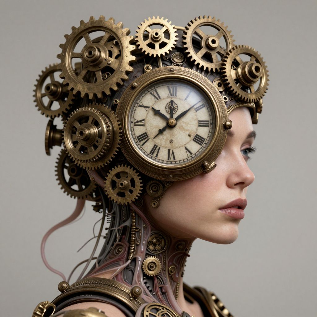 A steampunk-inspired visage emerges where a clock face seamlessly integrates into a woman's head, surrounded by intricate gears, cogs, and organic tendrils, blurring the line between human and machine.