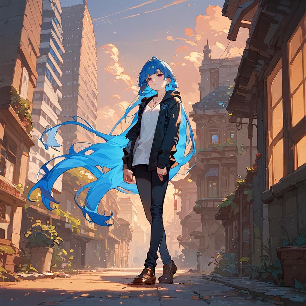Score_9, score_8_up, score_7_up, source_anime, 1girl, solo, full body, wating, on street, outdoors, building, display window, sunset, sky, very long hair, blue hair, bangs, brown eyes, flat chest, hoodie, open hoodie, shirt, pants, loafers, lipstick, necklace