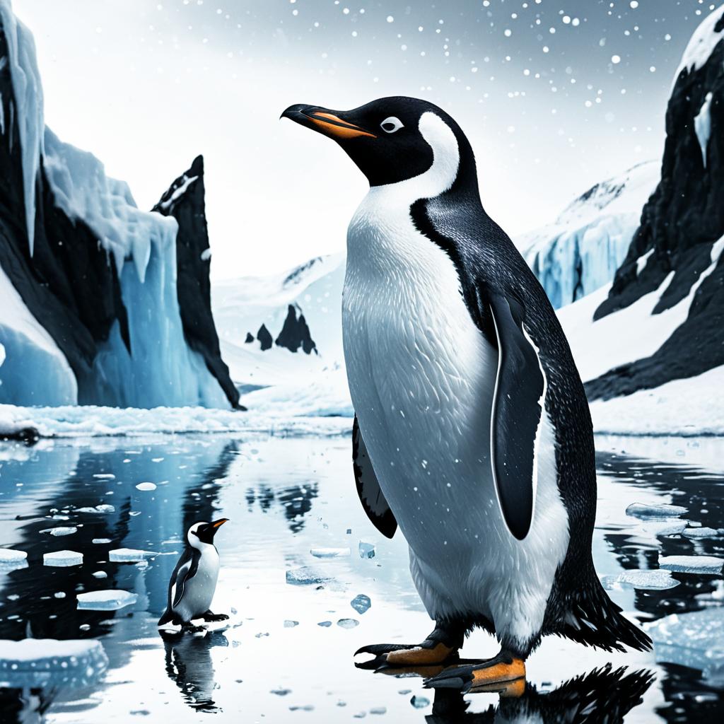 Detailed digital illustration of a humanoid penguin with sleek black and white feathers, shiny black eyes, and orange feet standing on icy terrain. The scene features a cold, snowy landscape with ice formations, frozen water, and reflective ice light, blending fantasy elements with photorealistic style.