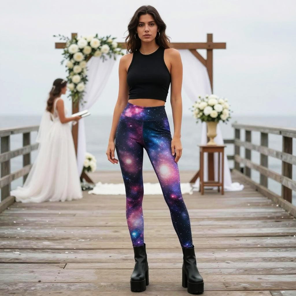 A woman, in a cosmic-inspired casual style, wearing a sleeveless black top and high-waisted galaxy print leggings, chunky black platform ankle boots, standing on a pier with a wedding ceremony in the background, visual style: jc staff. Sexy. Pretty face and beutiful eyes