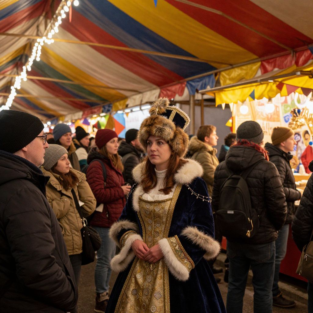 Photograph of a festive outdoor market. A young woman with fair skin and brown hair, wearing a medieval-style gown with a gold bodice, black velvet cloak with white fur trim, and a ornate headdress with black and gold accents, stands center. She looks slightly to her right. Surrounding her are people in winter clothing, including hats and jackets, engaged in market activities. The market stalls have colorful striped awnings in red, yellow, blue, and green. Warm string lights hang above, illuminating the scene. The background includes blurred market stalls with bright lights and various goods.